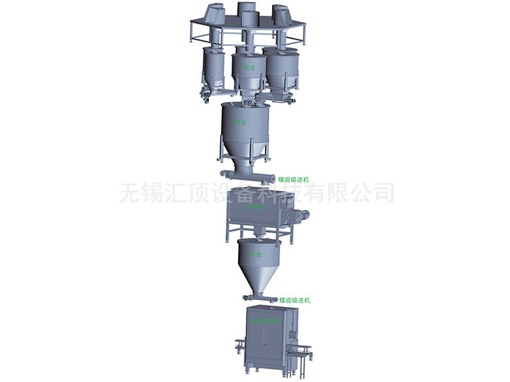 該配料系統主要用于多種物料的配料包裝輸送生產環節。該系統可包括原料上料輸送、原料儲存、選擇配方、自動配料、物料輸送、混合拌勻、裝袋縫包全過程。根據用戶的場地布局和具體要求,可進行差異化設計,滿足客戶對性價比的要求。
